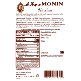 Monin Hazelnut Syrup adds rich, nutty goodness to lattes, mochas, smoothies, shakes and cocktails.