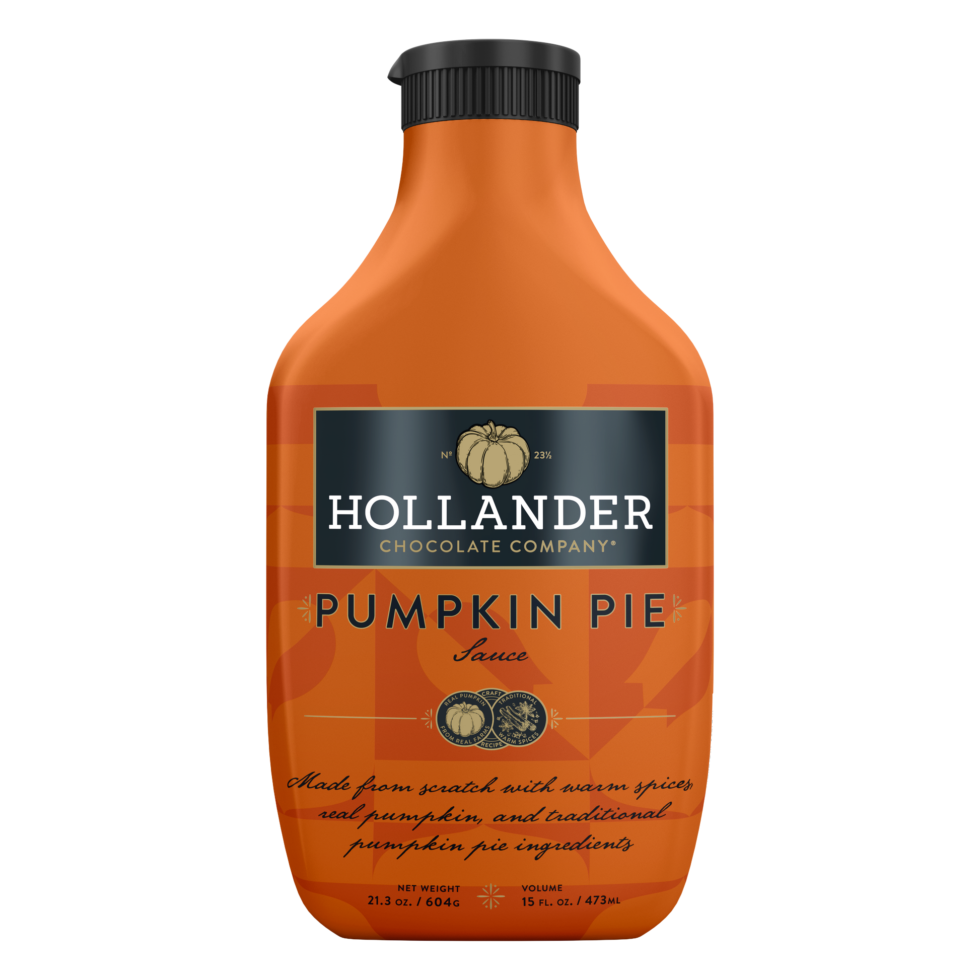 Hollander Chocolate Pumpkin Pie Sauce made from scratch with warm spices, real pumpkin, and traditional pumpkin pie ingredients. Made with chef-grade ingredients that do not contain soy or wheat.