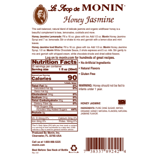 Monin Honey Jasmine Syrup delivers a well-balanced, natural blend of delicate jasmine and organic wildflower honey flavour to teas, lemonades, cocktails and more.